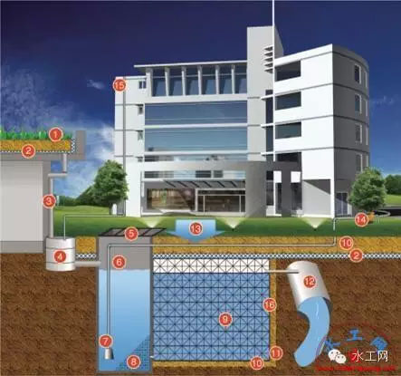 1、屋頂花園2、排水網(wǎng)絡(luò)3、重力雨水管4、過濾井5、井蓋6、排放控制井7、回用管路8、過濾網(wǎng)9、雨水模塊10、干凈的粗河砂11、防水層12、市政管道13、地表滲水14、地面水泵15、虹吸雨水管16、土工織物